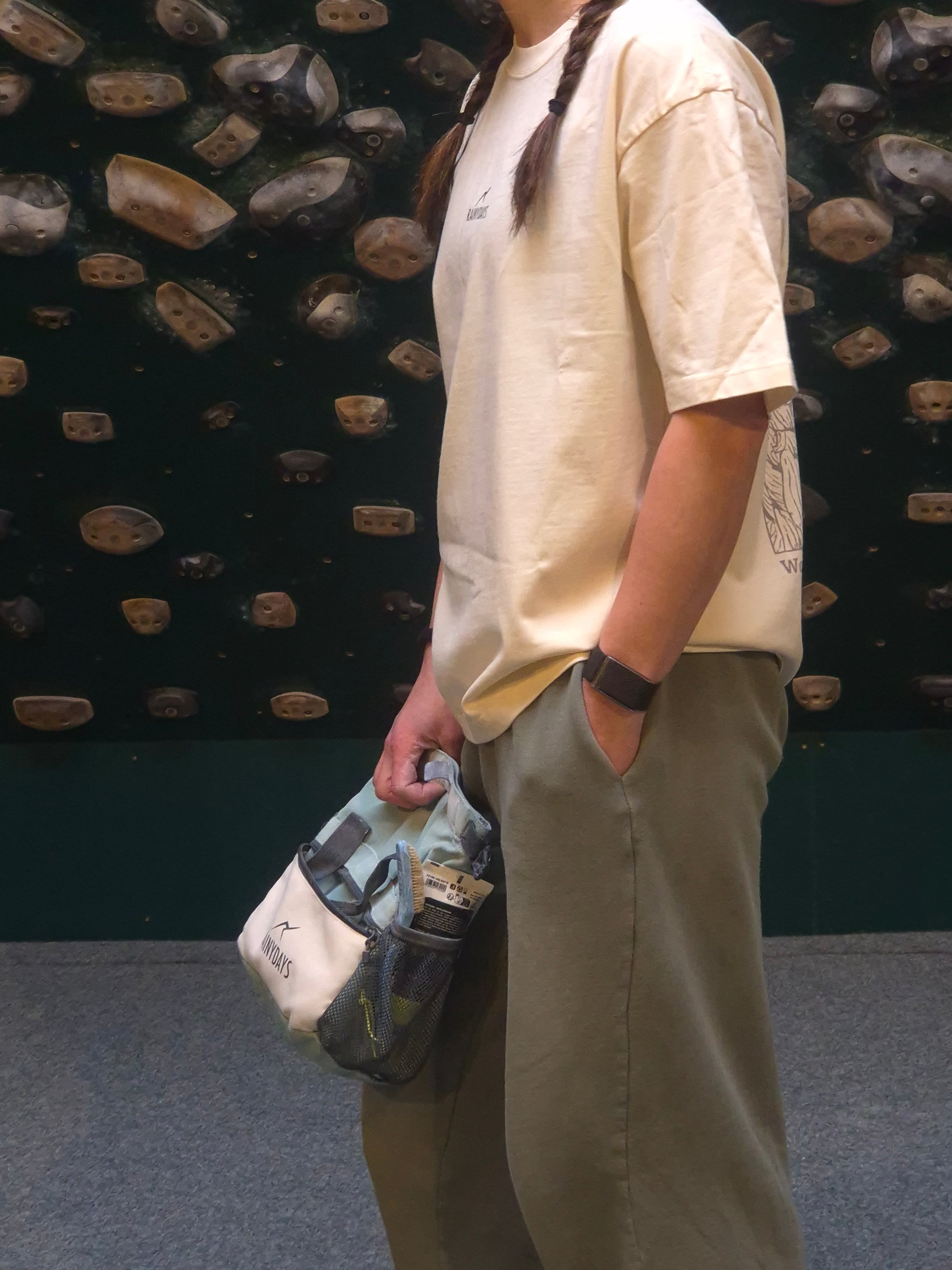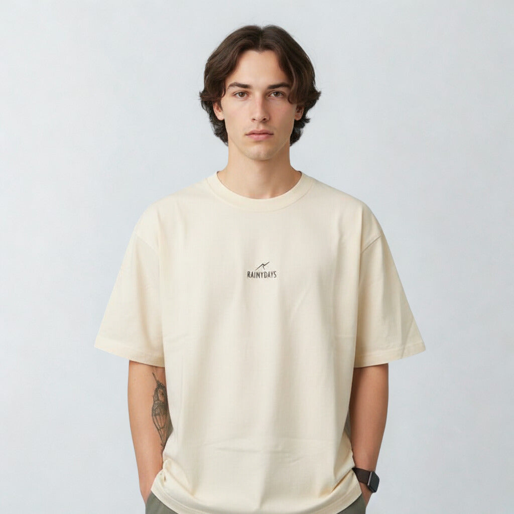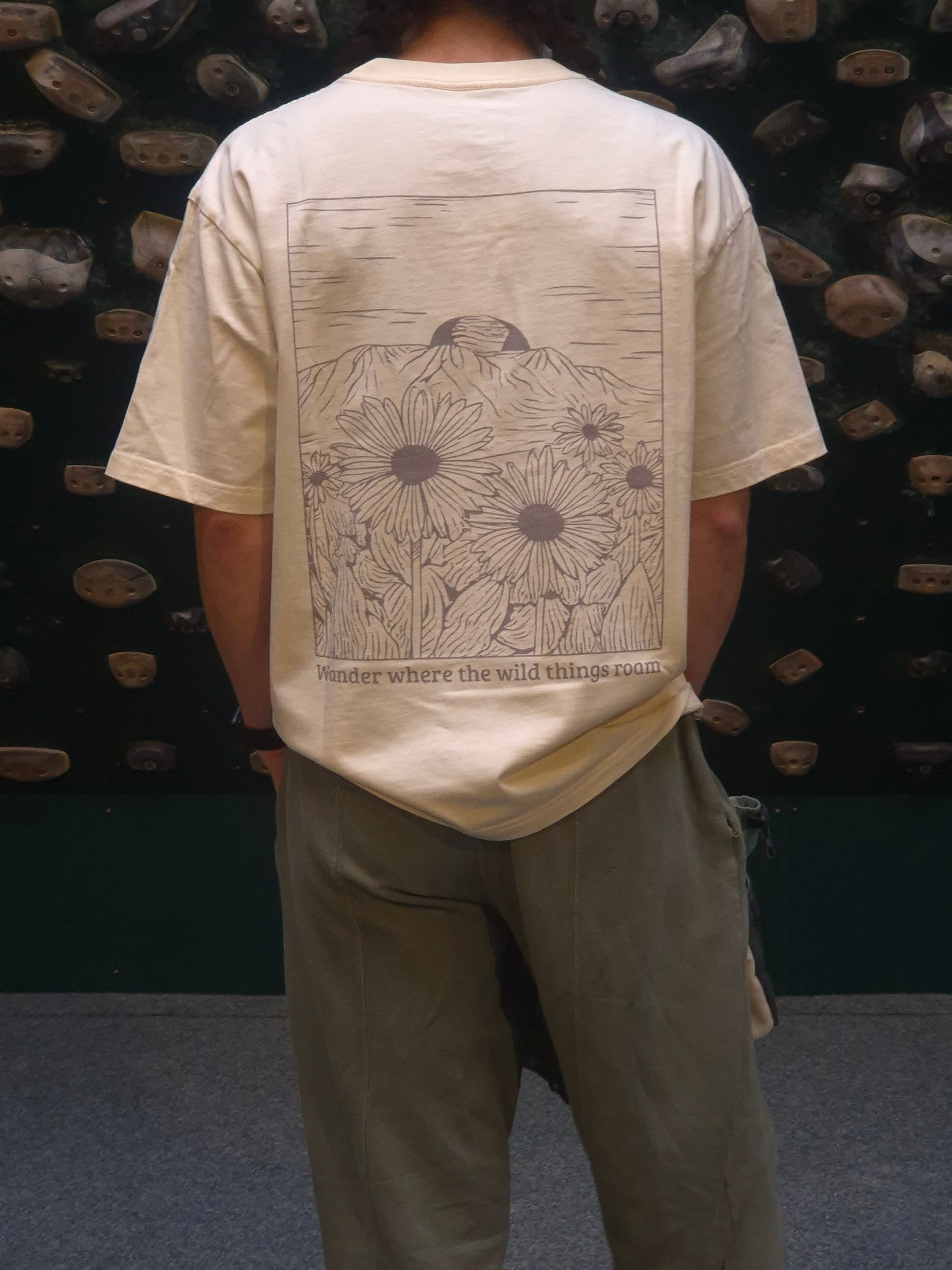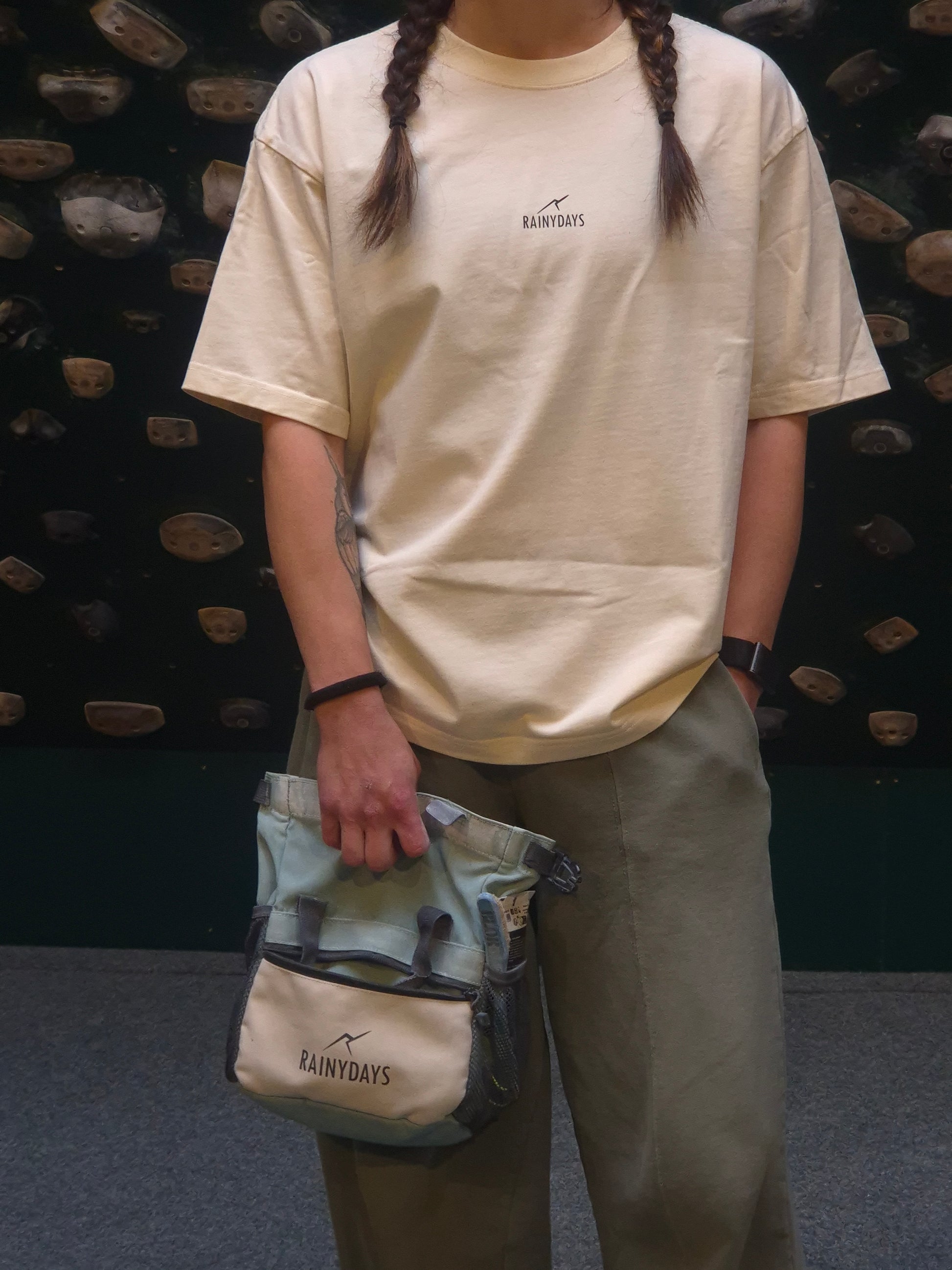 An oversized, boxy climbing T-shirt in a soft peachy yellow, designed for women first but made to look great on every climber. This unisex climbing tee features the RainyDays logo on the chest, while the back has a large grey climbing-inspired print with flowers and a sunset – a subtle tribute to your favourite bouldering sessions, rock climbing adventures and golden-hour stories still to come.
